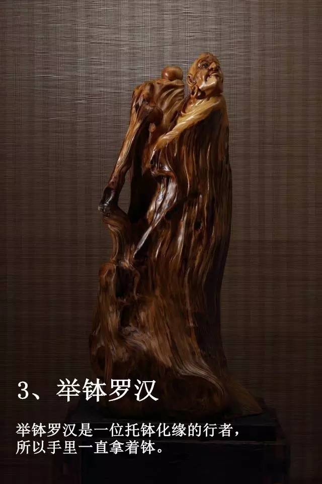 这一套价值500万元的崖柏根雕十八罗汉作品,根据崖柏根部的纹理走势、质感融合国画写意,七分天然,三分雕琢。形态各异,自成体系。