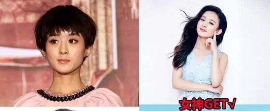 赵丽颖的中分发不仅修饰小脸型,同时展现出她清新灵动的气质,而她的锅盖头段阿飞造型让她变大眼小萝莉,完全没有女神的气质。赵丽颖的侧分长卷发很有质感,让她变清新女神,而不规则的齐刘海搭配蘑菇头给人感觉不止老了十岁。