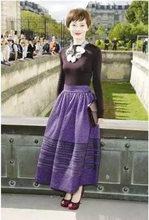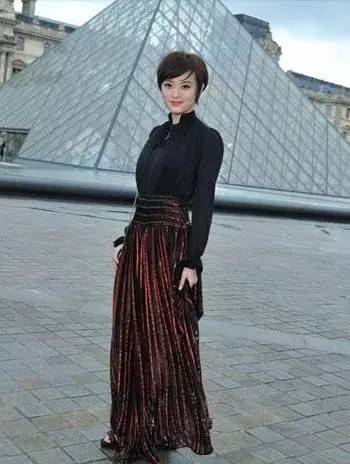 富婆孙俪上身黑色衬衣配上红色条纹长裙