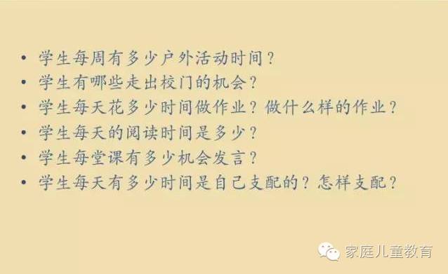 学生是学校的主体,家长应该把更多的视角放在学生身上。家长在看课表的时候往往把注意力集中在上课的时间上,喜欢去数每周有多少节语文课,多少节数学课。其实无论是哪个国家的学校,小学六年的课程大纲不会差别太大,无非是那些知识。该学的东西终归都会学到,三年级不会的五年级他自然就会了。但是如果一切向成绩看齐,那么一些更关键的东西可能会被忽略。所以我更建议大家去数一数孩子们每天到底有多少课外时间,户外时间,有多少时间在长脑子,有多少时间在长身体。这里我说的“走出校门”,不光是说走出那个physical的门,而是说他们有没有机会脱离课本,走出教室,离开学校,摆脱老师们一板一眼的传授,从生活中,从社会里学到些可能更重要的东西。