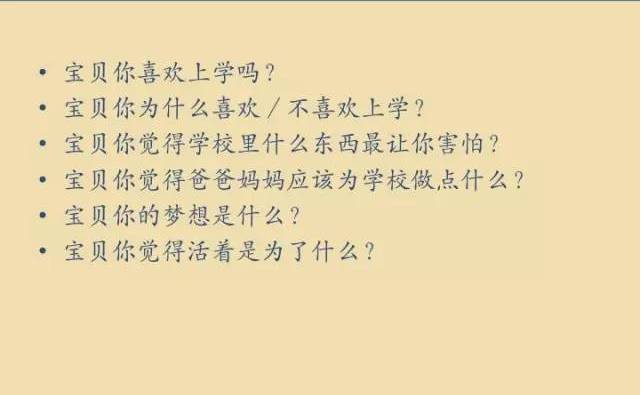 我最爱的阿拉伯诗人纪伯伦说:孩子是搭在父母弓上的箭。他有一天注定会离开你,尽早的让孩子成为他自己的主人,让你的存在成为他坚强的依托,但不是他随时的依赖。更多的给孩子一些思考的空间,给孩子一些选择的空间,给孩子一些让你知道他喜欢什么不喜欢什么的机会,我觉得比什么都重要,比之前的PPT内容更重要。所以如果你还没有做的话,请你花一点时间去问问你的宝贝一下这写问题,我觉得你可能会得到一些你意想不到的收获,你可能会帮助你做出一个更明智而善意的决定。