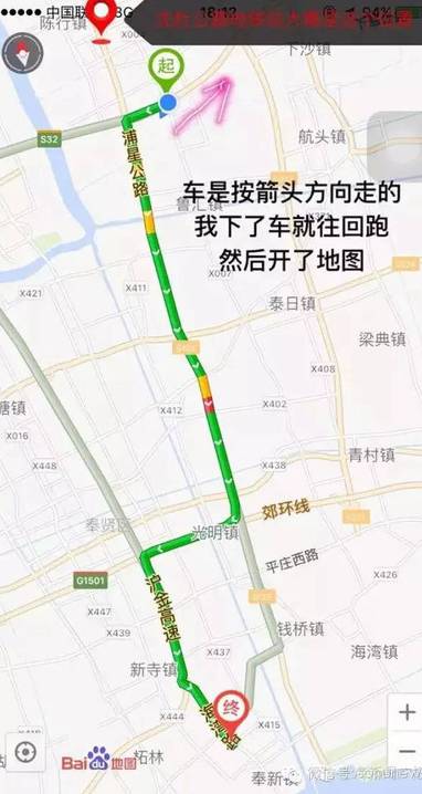 谁知司机的路径竟与平常的路线“南辕北辙”,按照正常的路线应该是从沈杜公路地铁站到小杨学校直走一条线就可以了,他的路线竟然是90度方向。