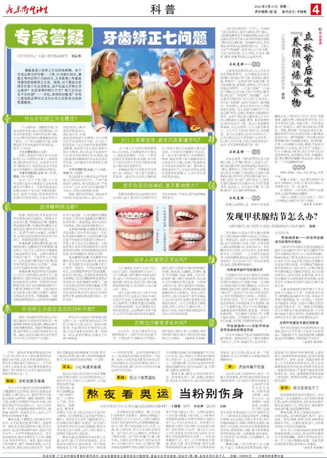 暑假是青少年矫正牙齿的高峰期。由于牙齿正畸治疗所需1~2年,时间相对较长,暑假又有将近两个月的时间,大多数青少年都选择暑假到医院矫正牙齿。然而,对于要做牙齿矫正的青少年及其家长,知不知道几岁矫正牙齿最好?该选择哪种矫正方式?矫正后牙齿会不会松动?……对此,本报特别邀请广东省口腔医院正畸科主任刘从华主任医师为读者答疑解惑。 问题一:什么时机矫正牙齿最佳? 一个人要想有一副整齐美观、功能完善的牙齿,就必须定期检查,发现牙床发育或牙齿排列的异常问题,应由正畸专科医师来衡量最佳的治疗时机。关于矫治的最佳年龄,还需根据孩子的牙齿错牙和类型而定,一般分三个阶段: ①乳牙期阶段(4~5岁) 该期主要适用于乳牙反牙合(俗称地包天),早期矫治有利于上颌骨发育,预防恒牙反牙合。如果孩子有不良习惯(如伸舌、咬唇等),在这个阶段也可以得到纠正,预防错牙合的发生。