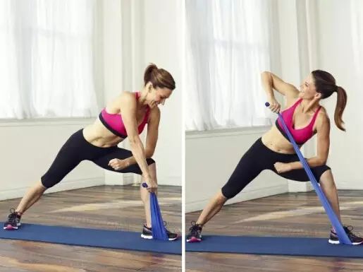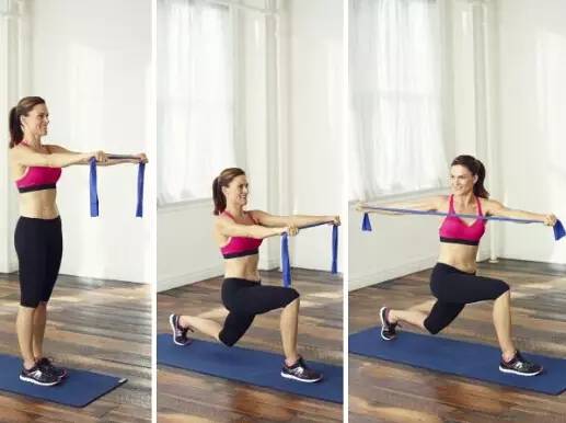 【做法】站姿,双手拉住拉筋带,与肩同宽。右脚弓步向前,左脚向后。接着,躯干扭转向右,尽可能将拉筋带拉伸到最大。然后回到起始动作,换另一侧重复。