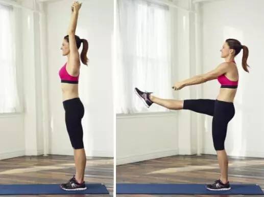 【做法】站姿,双手握拳举过头顶,保持手臂伸直。放下手臂置于身前,同时抬起右腿与地面平行。然后回到起始动作,换另一侧重复。