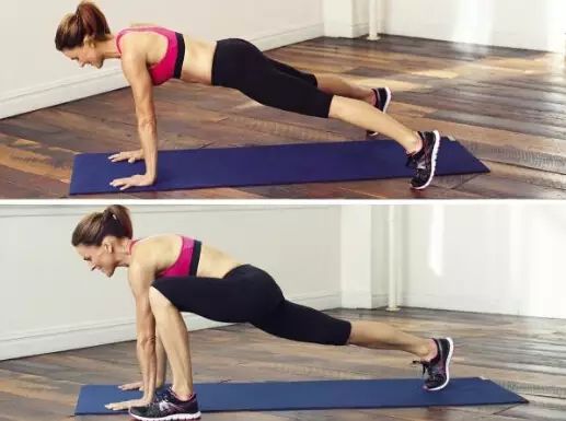 【做法】 从完全平板开始,双臂伸直,双脚并拢。然后,双脚跳开,比瑜伽垫宽,跳回。接着,左脚前伸,置于左手左臂外侧,放回,换右脚。这样算完整一个动作。