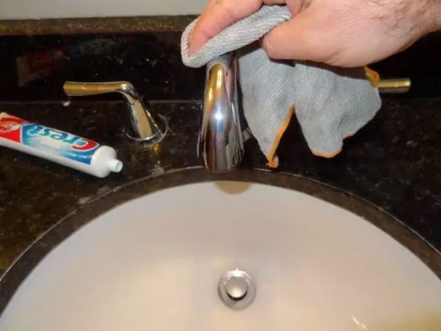 用抹布粘上牙膏,仔细擦洗水龙头和水槽