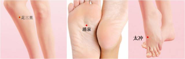 这三处就是“吃补药”。一个是涌泉穴一个是太冲穴一个是足三里穴。