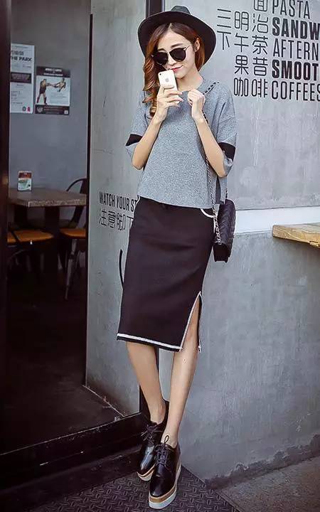 简约的拼色袖,宽松针织衫,搭配撞色侧开叉针织半身裙和漆皮松糕鞋,街头优雅潮范。