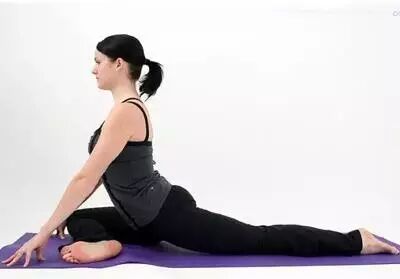 曲右膝,左腿向后伸展,躯干向前贴在右腿上,手放在身体前,低头放松。
