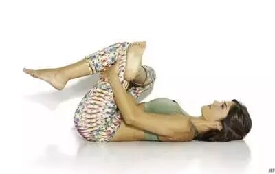 同时双手将左腿往胸部方向拉伸2-3分钟,然后换另一侧重复。