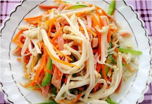 8.将绰好水的金针菇、青椒丝、胡萝卜丝、火腿丝一起加入适量的食用盐、鸡精、麻油拌均匀即可食用了