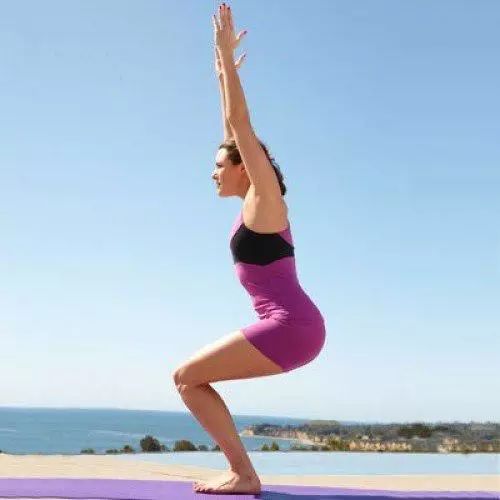 动作:站姿,双腿并拢,抬头挺胸,背部挺直。呼气,双腿并拢向后蹲坐,想象后方有一个座椅,直致大腿与地面成平衡。然后屈起脚底,令脚跟离地,保持这个姿态5至8个呼吸。吸气还原。