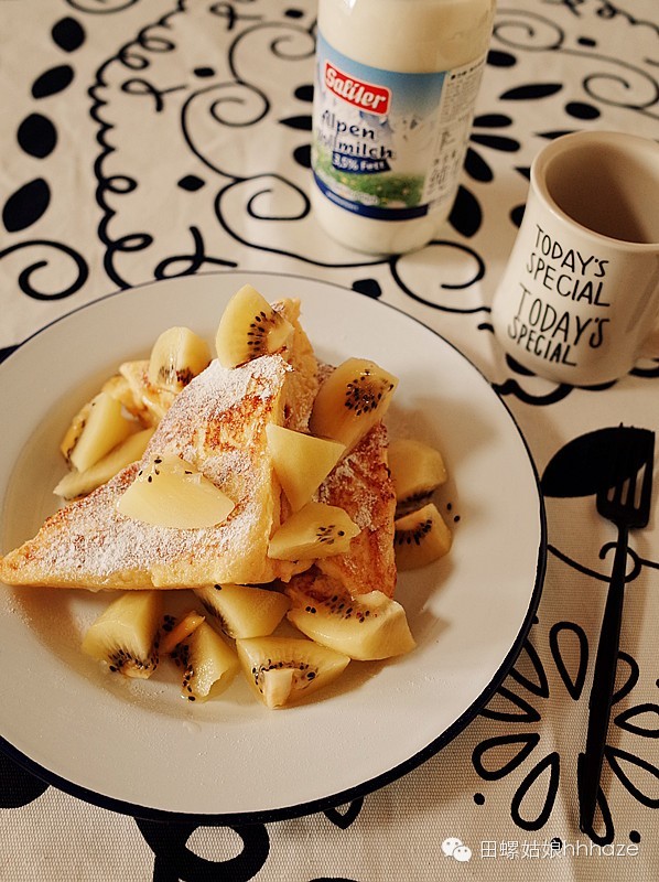 友情提醒,这款法式吐司里面有比较多的花生酱和蛋奶,再加上糖粉或者枫糖浆的甜度,吃多了难免会觉得有点发腻。推荐搭配黑咖啡、水果、沙拉之类的饮品或者配菜,解腻之余也能稍微降低一下罪恶度。