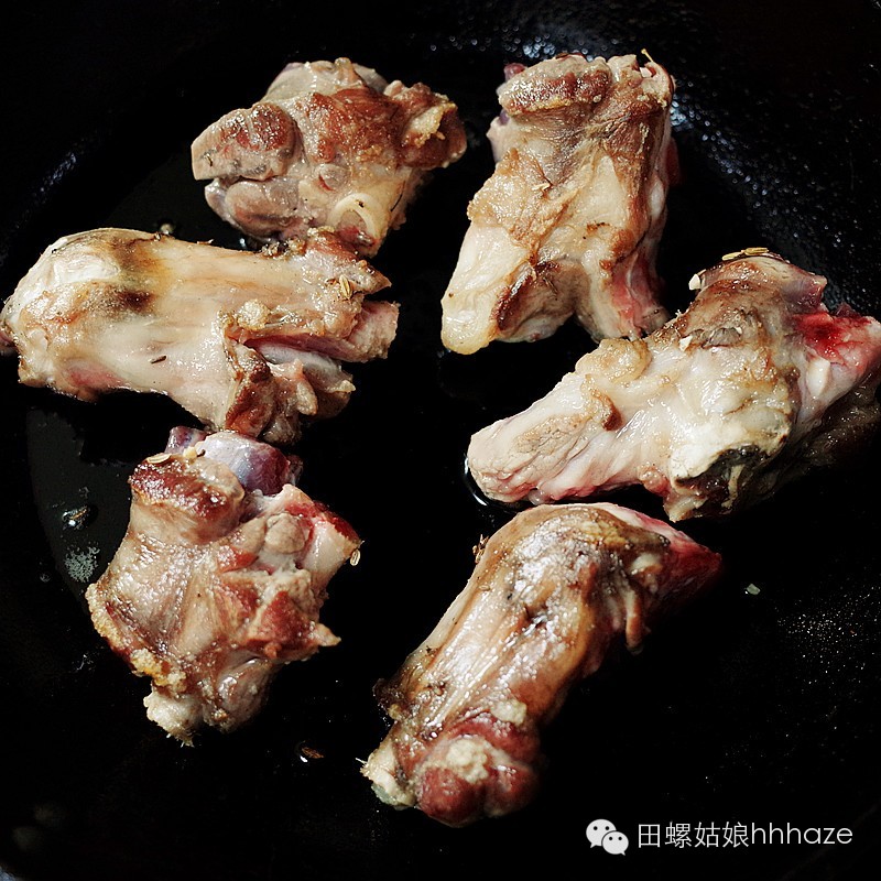 2. 羊膝洗净之后用厨房纸巾擦干,用适量橄榄油煎到两面焦香。
