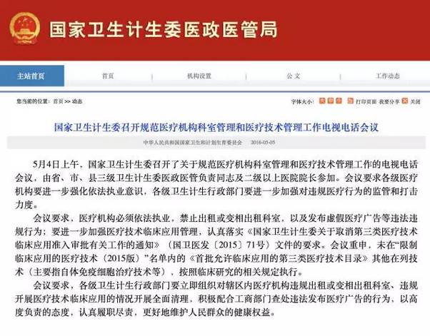别!担!心!这回国家发!话!了! 5月4日,国家卫生计生委召开电视电话会议,要求医疗机构必须依法执业,禁止出租或变相出租科室及发布虚假医疗广告等违法违规行为。
