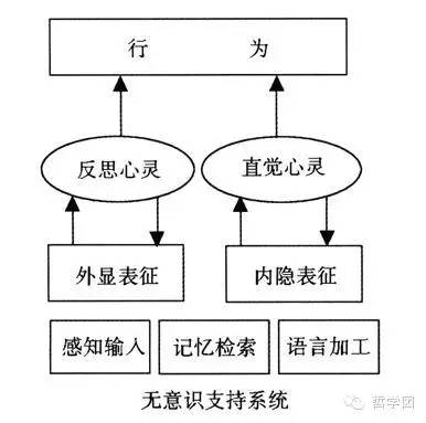 当然,这种心理二元性并不是当代哲学家的独创,它可以追溯到古希腊哲学家柏拉图那里。柏拉图认为心灵可以分成理智、情感和欲望;每个部分都是迷你型的自主体,有独立的目标和推理能力。后来,笛卡尔、莱布尼茨、洛克也曾经区分出人类和动物的推理能力,把人的心灵看作是和动物共有的部分如感觉、情感与人类持有的抽象能力所构成的。随着现近代无意识理论的发展,叔本华、尼采和柏格森强调人的非理性动机被加工成完成日常任务的自主加工系统,并被赫姆霍兹(Helmholtz)总结成一种独立推导系统。现代无意识理论专家拉格科克(Thomas Lagcock)、汉密尔顿(Willam Hamilton)和卡彭特(Willam Carpenter)分别提出神经反射理论、心理潜伏理论、潜意识理论,从不同侧面揭示人类心灵的“海底大陆架”。真正把心理二元构形提升到系统描述则首推弗洛伊德,他把人的心灵看作是由有意识和无意识加工系统构成的,并分别以不同方式的运行形成两种“我”即自我和非我(或者称本我、自我、超我)。