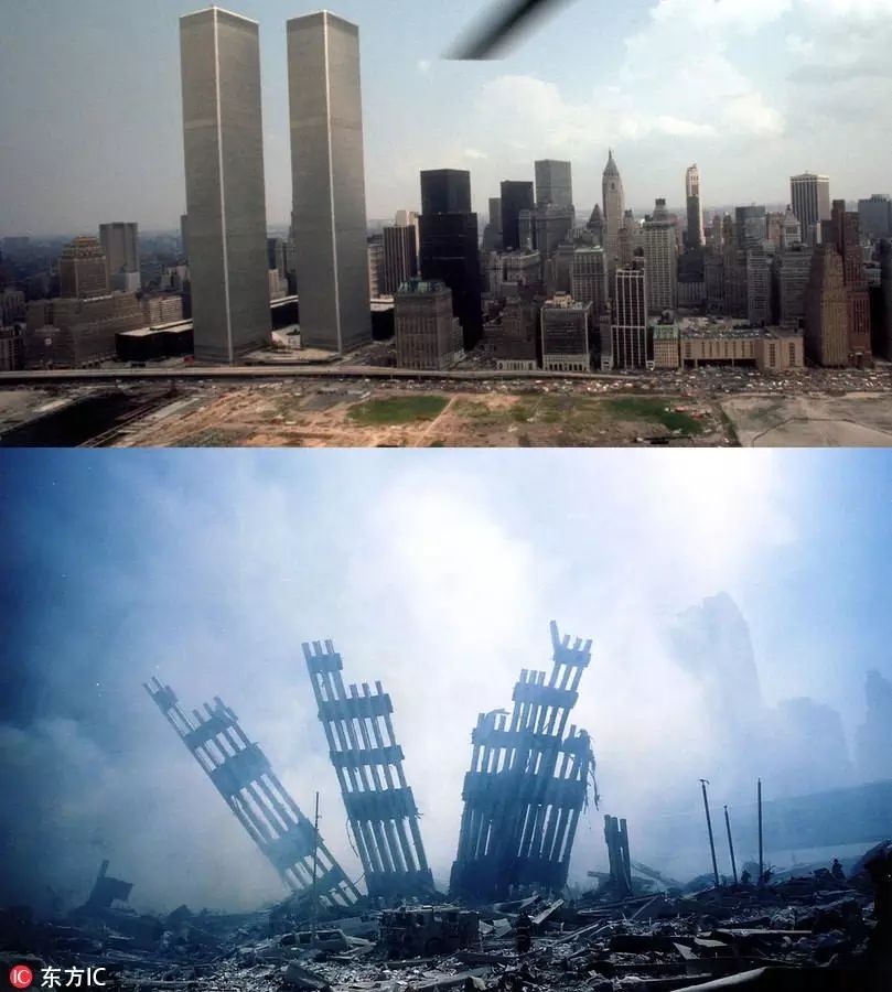 ▲911恐怖袭击前的纽约世贸中心与遭恐怖袭击后纽约世贸中心残骸。