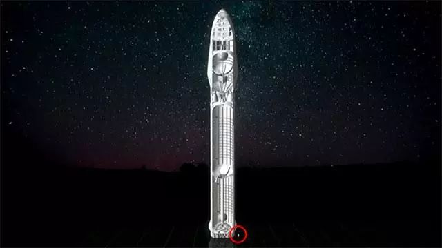 SpaceX公司“星际运输系统”中超级火箭BFR与人体的对比图,右下角圆圈内为人体大小。