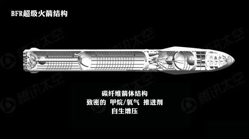 按照马斯克演讲中的描述,BFR火箭箭体高度77.5米,干重275吨,推进剂重6700吨。火箭底部装备42台猛禽发动机,海平面推力128MN,真空推力138MN,可重复使用1000次,真正实现火箭复用民航飞机化。BFR超级火箭近地轨道运载能力为450吨,推进剂使用液氧和甲烷。BFR与MCT分离时速度将达8650千米/时,BFR将使用推进剂质量的7%完成返回着陆。