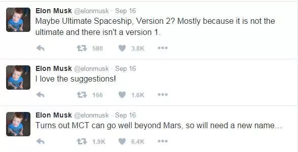 马斯克在9月16日为未来的火星殖民运输器(MCT)征集新名称,并希望它不仅仅只用于火星。