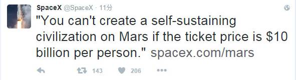 SpaceX官方社交账号在演讲开始后发布的状态:如果前往火星的票价高达100亿美元/人,是无法创建一个自给自足文明的。