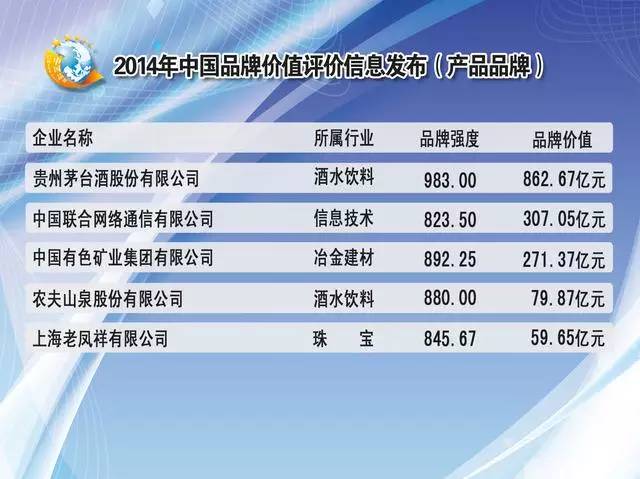 #2014年品牌价值评价信息#【2014年中国企业品牌价值评价哪家强:茅台、农夫山泉均上榜】今天,中国中央电视台独家向全球发布“2014中国品牌价值评价信息”,由于今年是首次发布,评价结果暂不分行业领域,而实行综合排队,2014年中国品牌价值评价信息发布(产品品牌)。