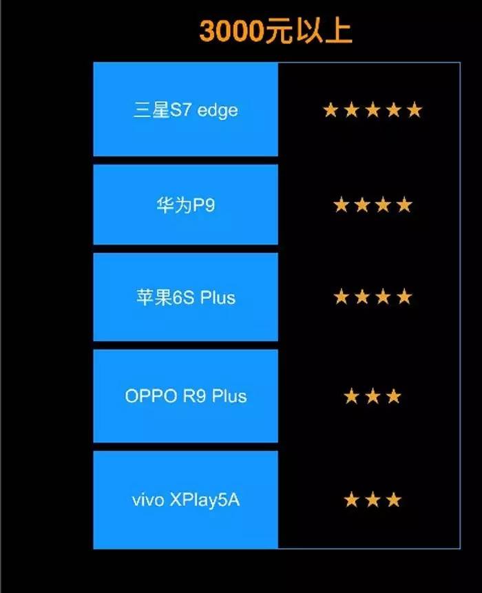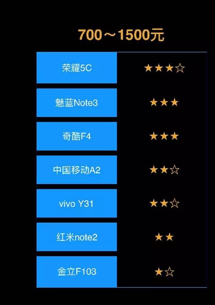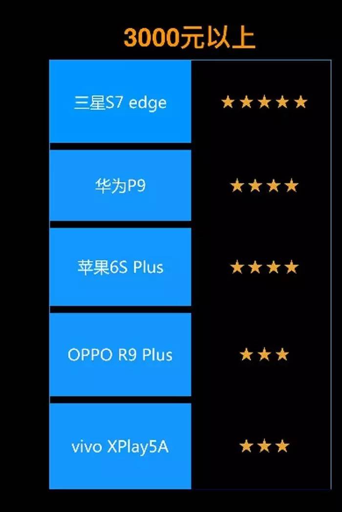 《2016年终端质量报告》选取3个价位段的19款热门机型依照14个客观指标,模拟12个主观典型场景,得出下面的排名: