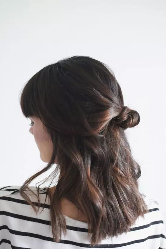 2、多出来的发尾藏在发结后面,用发卡固定好,半扎丸子头就完成了,就是这么简单。