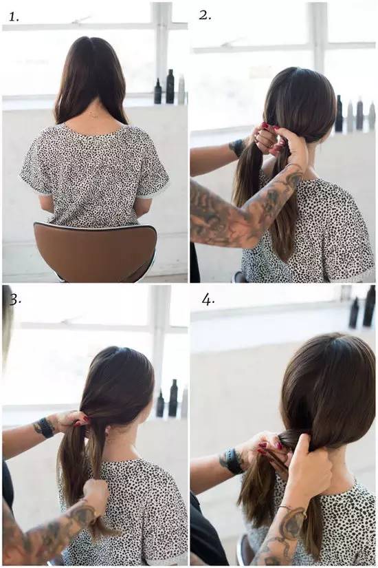 2、将第一根发辫拉进剩余的头发扎成一个低马尾,绕橡皮筋时最后一圈不要将头发全部拉出,盘出一个发髻。