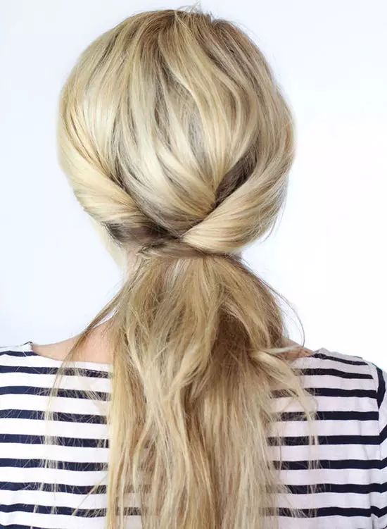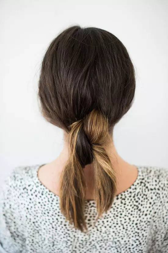 3、打结后长出来的头发绕到马尾的后方,用发卡将尾端的头发固定紧,藏在马尾的后方。