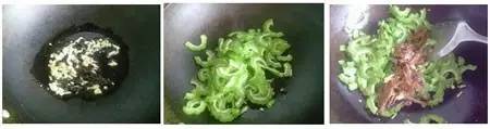 5、油五成热,转小火放入一半蒜碎和豆豉,爆出香味后加苦瓜同炒,苦瓜变色后加入鲮鱼和剩下的一半蒜碎同炒片刻,加入少量糖炒匀即可。