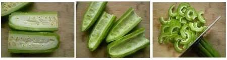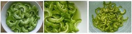 3、苦瓜洗净后切成两段,对半剖开,挖干净中间的瓤,切成厚薄适中的片;