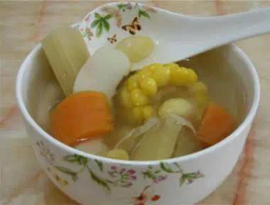 材料:大薏仁2两,腐竹2张,银杏10粒,玉米2条,红萝卜1条,陈皮一片