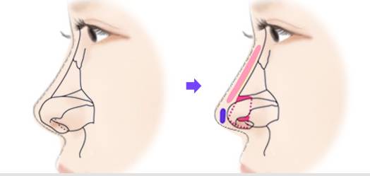 使用鼻中膈软骨或耳软骨做鼻梁的延长及支撑,接着,将下侧鼻翼软骨往下拉长,并将其固定在支撑的软骨上面。最后在鼻尖的部位再取耳软骨移植做鼻尖的修复。