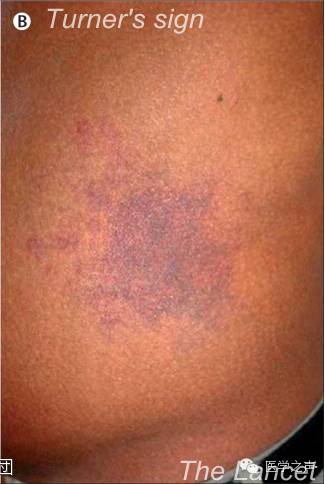 Grey-Turner征:双侧或者单侧腰部皮肤出现蓝-绿-棕色大片不规则瘀斑,以发生在左侧者居多,最初为青紫色渐变为青色再浅至暗灰蓝色。它多出现于重症急性胰腺炎(急性出血坏死性胰腺炎)症状出现后的3天到一周内。此外还可见于胰腺外伤和腹膜后血肿等。