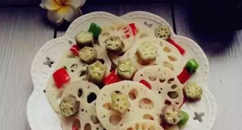 8.莲藕秋葵 材料:莲藕2根(九孔)、秋葵2根、胡萝卜半根、葵花子油、盐巴、生抽、鸡精各适量。
