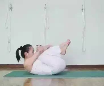 做法:坐在毯子的前端。双腿弯曲,脚踩住地面,双手扶住膝盖,把小腹收紧,下巴内收。然后让背部在地面上像摇篮一样前后滚动。