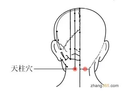 天柱穴寻找方法: 天柱穴位于后头骨正下方凹处,也就是颈脖子处有一块突起的肌肉(斜方肌),此肌肉外侧凹处,后发际正中旁开约2厘米左右即是此穴。