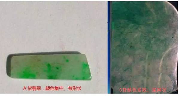 放大镜或肉眼看翡翠的颜色。天然翡翠颜色有色根,颜色有形,分布不均匀,染色翡翠颜色发散,无形,有浮感,呈丝网状分布于表层。