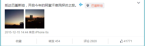 但是,巴基斯坦也不消停。12月15日,抵达巴基斯坦首都伊斯兰堡后,姚晨发了微博:“联合国安保系统对当地危险系数评估为D级,最高为E级……愿我们此行平安。”危险,并非危言耸听,当地难民署用最短时间给姚晨团队普及了安全防御课。“听得人头皮发麻,没来得及多想就驱车前往难民营。六小时车程,天黑前须到达,途中只允许上一回厕所。”摄影师许闯说,第一次感受到了被AK47带着上厕所的安全感。
