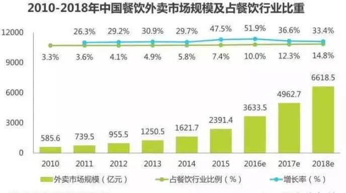 2015年我国餐饮外卖市场规模已超过2300亿,占整体餐饮消费的比例为7.4%,到2018年,这一比例有望达到14.8%,外卖市场整体规模也将超过6600亿。