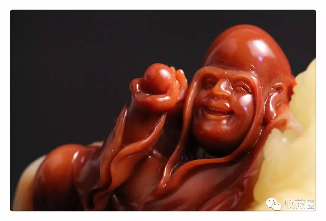工艺:手工立体雕刻,鲜红部分雕刻长眉罗汉,乳白部分雕刻童子坐于鱼篓上,造型饱满,细节动人。