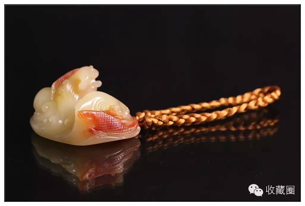 工艺:立体雕刻,红色部分巧雕鲤鱼两只,白色为浪花,刻画细致精湛,耐赏耐玩。