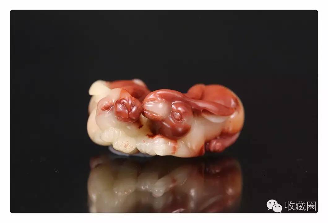 材料:天然寿山双色芙蓉石,偏凝冻质地,基调柔白凝润,带点点朱砂,或聚或散,使整体色调更加欢快活泼;