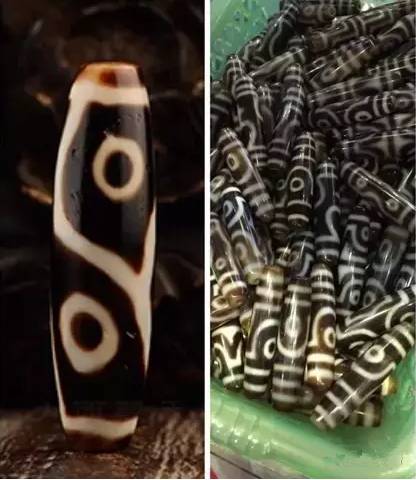 左是古代工艺的古董天珠,右是现代工艺饰品天珠