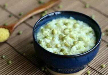 绿豆100克煮至豆皮开裂时,加入粳米50克,同煮粥,加适量白糖调味食用。有清热解毒,止渴除烦,利水清肿作用,适用于暑热烦渴,疮毒疖肿,高热口渴,小便不利,食物中毒,以及预防中暑。本品可作为夏季清凉饮料。