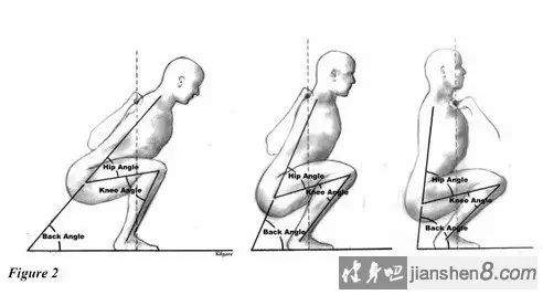 常见错误(如下图):下蹲时屈髋角度过大。导致身体过度前倾。起身时屁股先抬起、或甚至用背部力量顶起负重,接着大腿才出力让膝盖伸直。