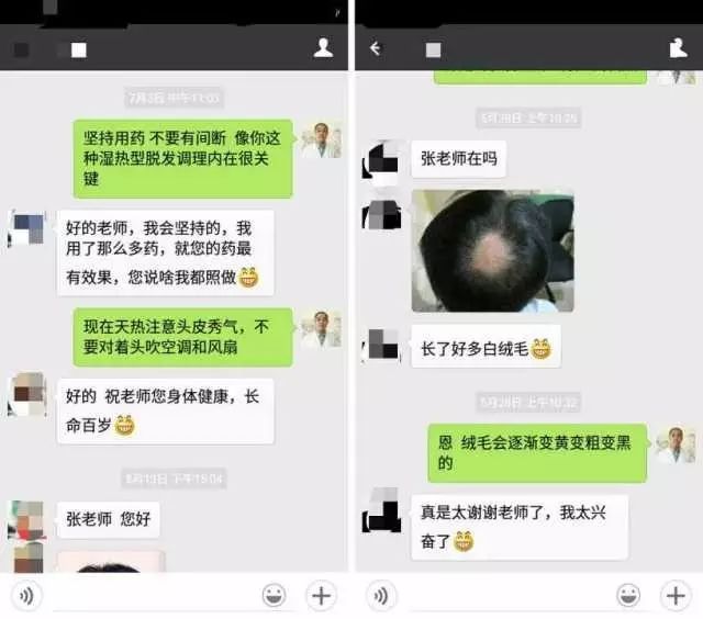 加微信,老中医还你满头秀发张老师为人低调,淡泊名利。他常说行医问诊要对得起老祖宗,对得起自己的良心,见不得唯利是图!尤其是治像脱发这种疑难病症,更是马虎不得。他常说脱发人承受着很的重心理压力,时刻觉得自己低人一等,很害别人用异样的眼光看自己。所以,他希望能给他们最好的帮助,也希望脱发的朋友能把自己的问题说出来,只有在他充分了解之后,才能针对病情进行配药。