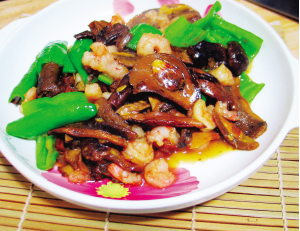2、倒入炸好的蘑菇,翻炒均匀,至汤汁浓稠时加入鸡精,香油,出锅